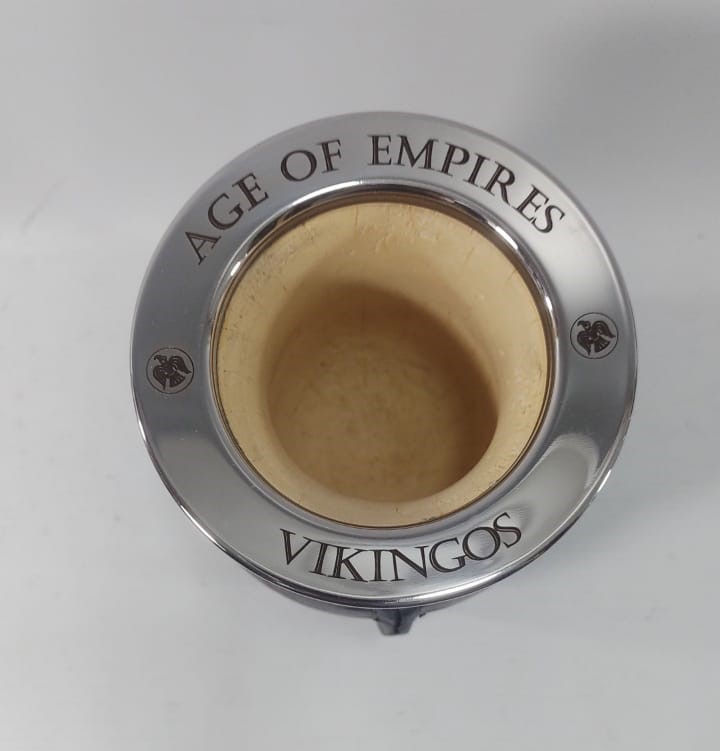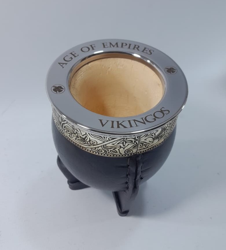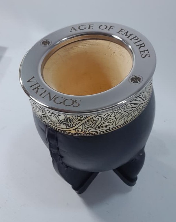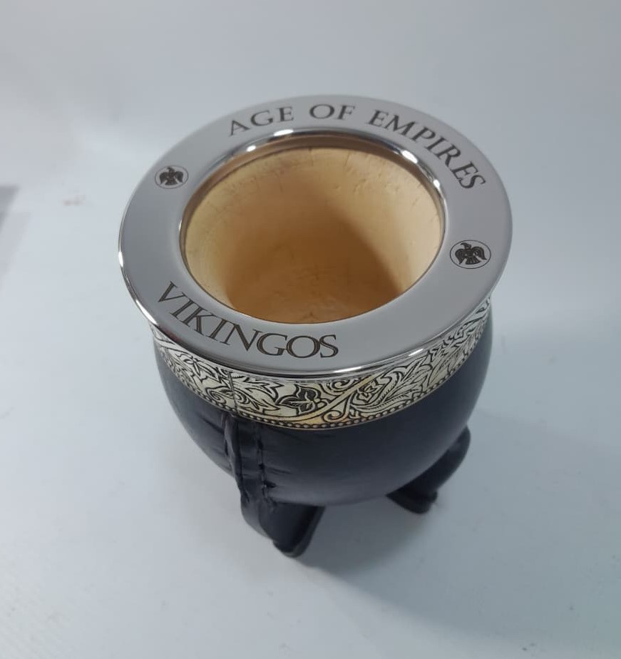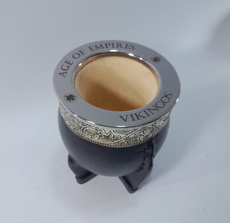 A gourd mate cup lined with alpaca and a ferrule engraved with the Spanish motif.