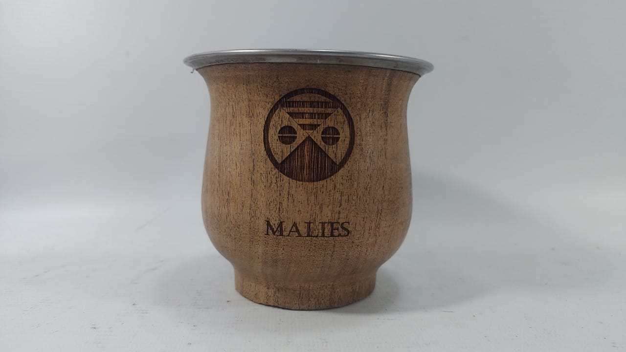Mate Camionero de algarrobo grabado con el escudo de los Malíes y con virola.