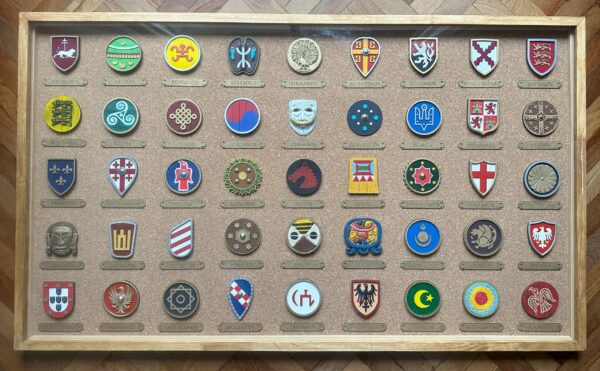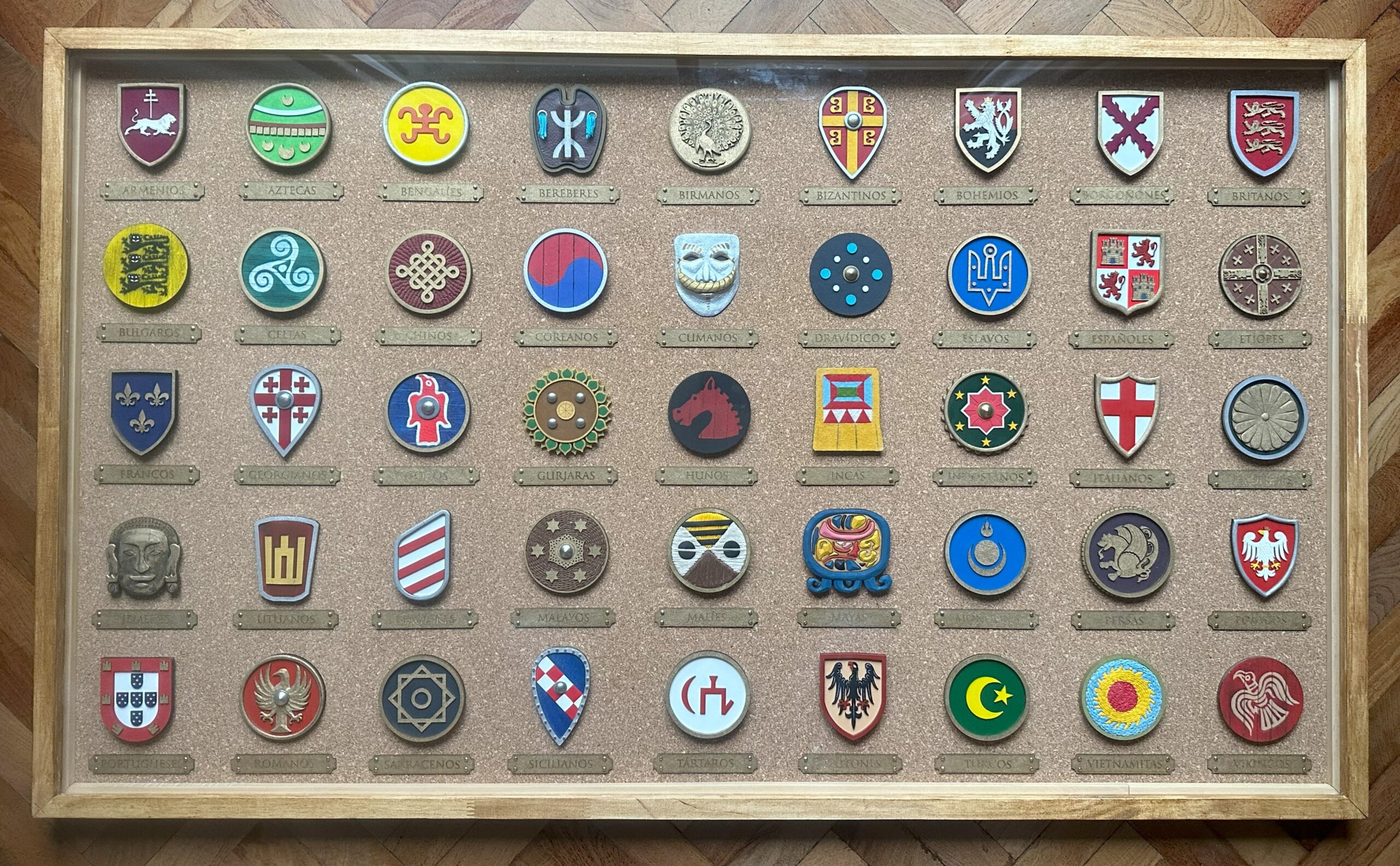 For a description of the materials used in each shield, see each individual post. The combo comes with a badge with the name of each civilization, a frame, and a piece of glass so you can hang it wherever you like, just as shown in the image.